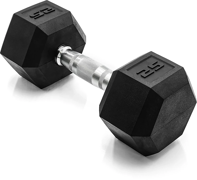 Stay comfortable during your workout by lifting the CAP Barbell 25 lb. Coated Hex Dumbbell. The rubber heads keep the dumbbell from damaging floors, and the ergonomic handle reduces fatigue in your hand and improves comfort. The hex design prevents the dumbbell from rolling.