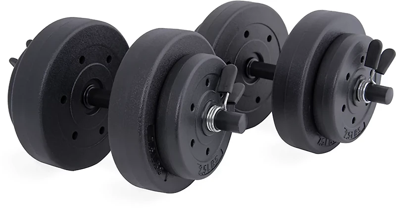 - 2 14-inch dumbbell handles and 4 spinlock collars are durable and secure
