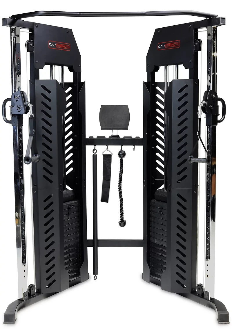 Perform a variety of strength and functional training exercises with the CAP Barbell Pro Edition Functional Trainer. The articulating arms provide a full range of motion for safe and secure training, while arm carriages can be adjusted to let users perform seated or standing lifting exercises. The chrome-finished tubing allows for smooth and easy pulley adjustments, and a powder-coat finish affords durability.
