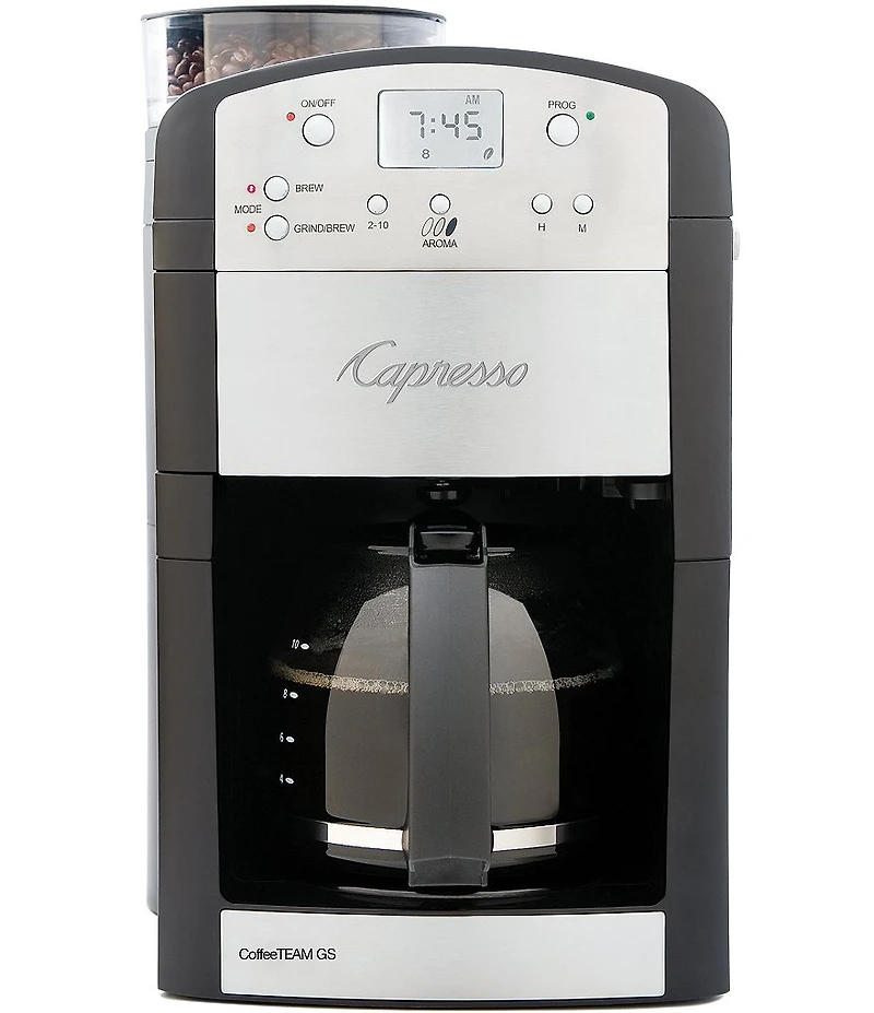The CoffeeTEAM GS automatically grinds fresh, whole beans immediately before brewing which is essential to preserving the most flavor from the coffee. The conical burr grinder and direct-feed technology allow for a compact, space-saving design. From Capresso, this coffeemaker features: Freshly grinds whole coffee beans directly into the filter then automatically brews up to 10-cups of coffee 10-cup glass carafe with ergonomic handle has brew-through lid and drip-free pouring spout Permanent gold tone Filter is easy to use and clean 24-hour programmable clock/timer with easy-to-read LCD display shows time, grind and strength settings Large 6-ounce bean container holds enough beans for 20 cups of brewed coffee before refilling Five fineness settings for light to dark beans let you adjust the grinder to your preferred taste (the darker/oilier the bean, the coarser the setting) Direct-feed technology accommodates a more compact design and keeps moisture away from the grinder Detachable see-through cover lets you check the flow of the ground coffee and makes it extremely easy to clean the grinder channel Brewing temperature over 200°F; temperature in pot after brewing is 180°F Charcoal water filter removes up to 82% of impurities Drip stop for pouring a cup while brewing Coated non-stick warming plate Two-hour safety shut-off Approx. 15.5"H x 9.5"W x 9"L Weight approx. 9 lbs. Imported.