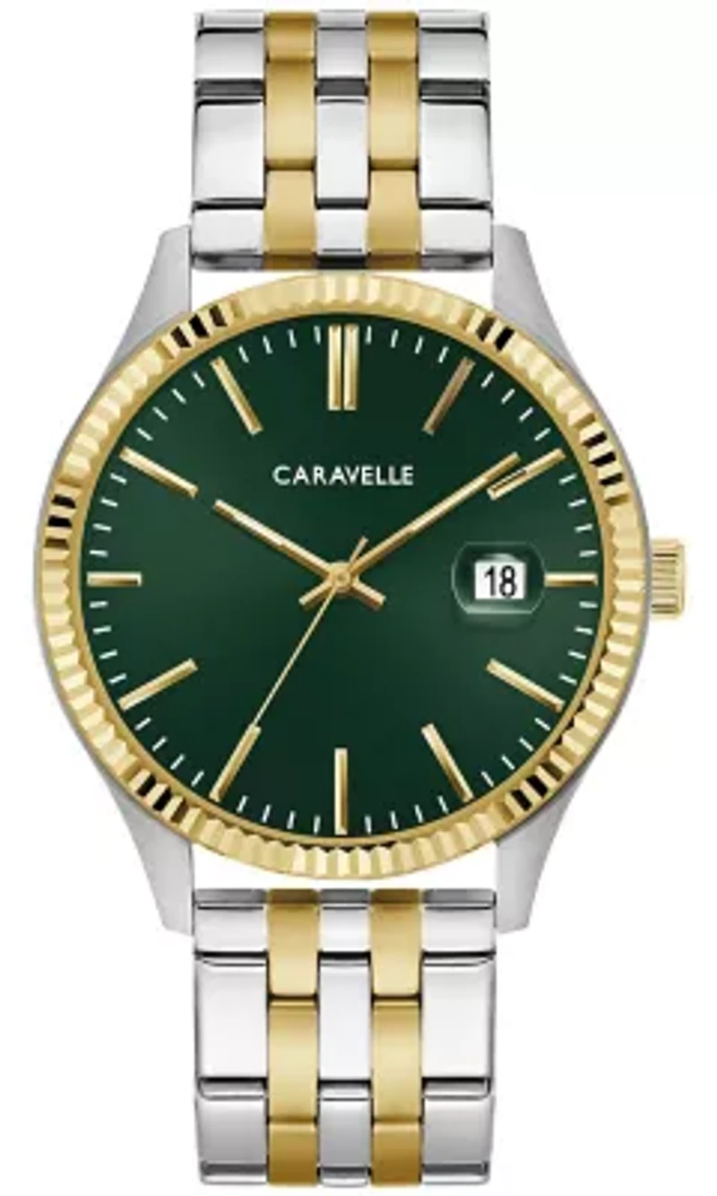 A sleek and streamlined men’s timepiece from Caravelle. This watch features a silver-tone stainless steel case with a grooved gold-tone bezel for a classically luxurious look. The rich and radiant green dial is appointed with gold-tone baton indices and a matching gold-tone handset with luminescent fill for low-light legibility, while the date display is enhanced by magnifying element on the mineral crystal. The watch is completed with a coordinated two-tone stainless steel bracelet with a push-button fold-over closure. An accessible sophisticated Caravelle men’s timepiece. Foldover clasp Analog dial Quartz movement Date display Choking hazard Warranty available, Limited liability warranty, 3 Years Limited liabilty warranty Imported Product Specifications 47mmx41mm 41mm Material & Care Metal, Stainless steel Clean with a damp cloth or soft brush.