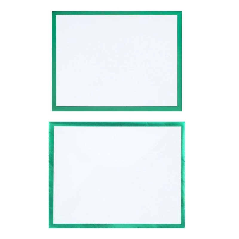 Send season's tidings—a yearly recap with a holiday family photo—and New Year's wishes to friends and loved ones using this card and envelope set. Featuring a green foil border design on both card and envelope, just add your stamps and an address and you're ready to send off your well wishes!DetailsGreen and whiteA2 formatPaper and foilContents:24 cards: 4.25" x 5.5" (10.7cm x 13.9cm)24 envelopes: 4.5" x 5.75" (11.4cm x 14.6cm)