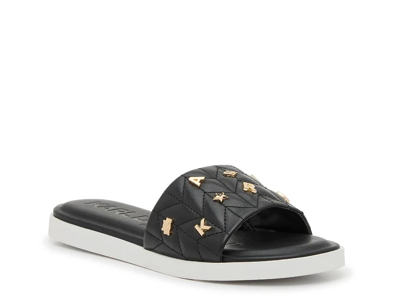 Catch eyes when the weather gets warm with the Karl Lagerfeld Paris Carenza sandal. This slide sports a quilted leather upper with bold metallic studs that sharpen up your look, while the classic silhouette ensures stylish versatility.