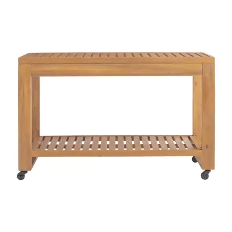 Made of solid teak with a natural finish, this outdoor kitchen island adds handy surface space and clean-lined good looks to your patio, deck, or garden. A set of wheels with 2 locking casters allows for easy transport and ensured stability when secured in place. With a handsome slatted surface and open storage shelf, this versatile wooden cart provides a welcoming perch for drinks and appetizers, as well as a prep surface for your next cookout.