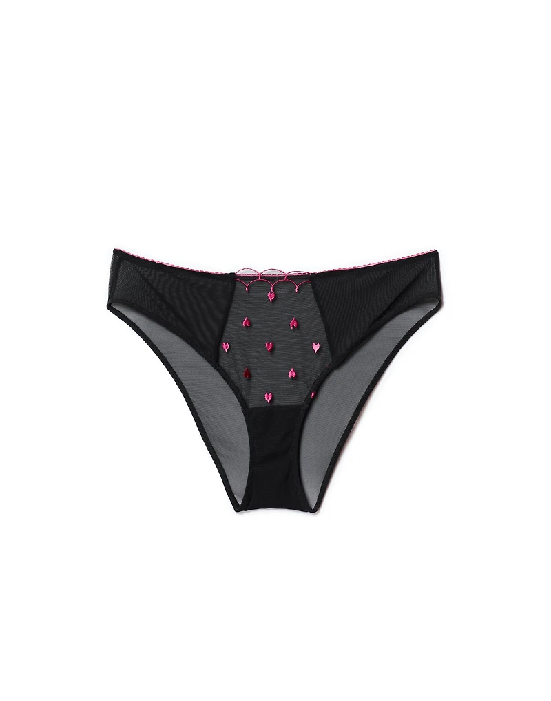 The Caroline High Cut Black embroidery high cut is a playful twist on a classic silhouette. It features scalloped edge heart embroidery and contrast embroidery and elastic details for a charming finish. Elevate your lingerie collection with this charming piece. (Available in sizes XS-XL.)