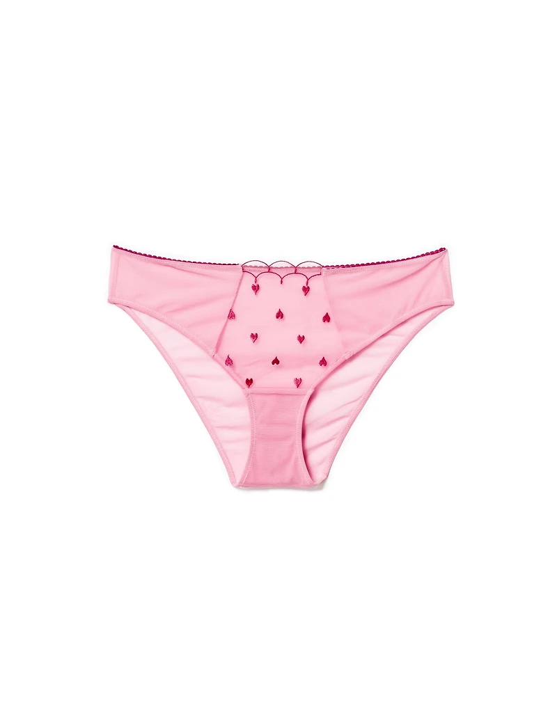 The Caroline High Cut Medium Pink embroidery high cut is a playful twist on a classic silhouette. It features scalloped edge heart embroidery and contrast embroidery and elastic details for a kitschy, eye-catching finish. (Available in sizes XS-XL.)