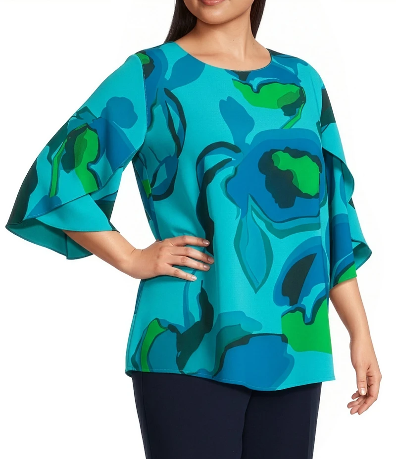 Caroline Rose Plus Copa Abstract Floral Print Matte Crepe Scoop Neck 3/4 Tulip Petal Sleeve Tunic