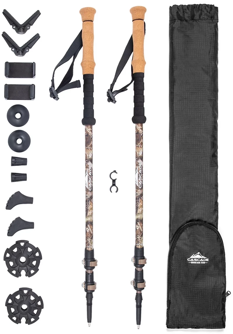 The Cascade Mountain Tech Carbon Fiber Quick Lock Camo Monopods 2-Pack is a great companion for photographers, hunters and hikers. The cork grips will stay comfortable in your hands during long treks, and the 4 sets of additional tip covers let you trek all through the 4 seasons. The carbon fiber shafts resist wear and tear when twisted or flexed, and the quick lock mechanism lets you easily adjust the height of the poles.