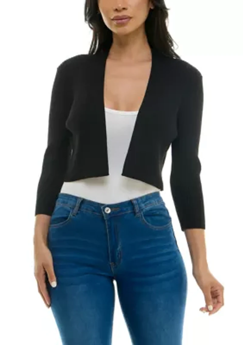 This womens bolero features a ribbed knit fabric in a cropped silhouette with an open front and straight hem. It has three-quarter cuffed sleeves and a collarless neckline for versatile layering. Open front Boat neck, Collarless Three-quarter sleeve Unlined Imported Product Specifications 17" Material & Care Polyester/Rayon Machine washable