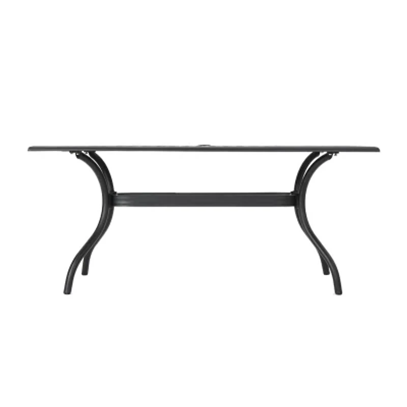Umbrella Holder: This set includes a rectangular dining table that seats six. This includes a hole in the center of the tabletop for you to insert an outdoor umbrella of your choice.