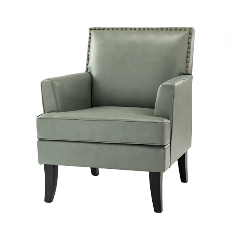 Bring timeless sophistication to your space with this Celadon Sage Faux Leather Accent Chair. Generously padded for comfort, the seat cushion and wide armrests provide a cozy retreat for reading, relaxing, or entertaining. Chair measures 27.5W x 28.5D x 34H in. Crafted with a wood frame Upholstered in green faux leather and filled with high-density foam Black wood leg finish Features a built-in S spring seat Accented with brass nailhead trim Seat measures 18.5W x 19.5D x 19H in. Weight: 33 lbs. Weight capacity: 250 lbs. Assembly required Not intended for commercial use Care: Wipe with a soft, dry cloth. This item is available at Kirklands.com only, not available in stores. Please note: this item cannot be shipped to APO/FPO addresses.
