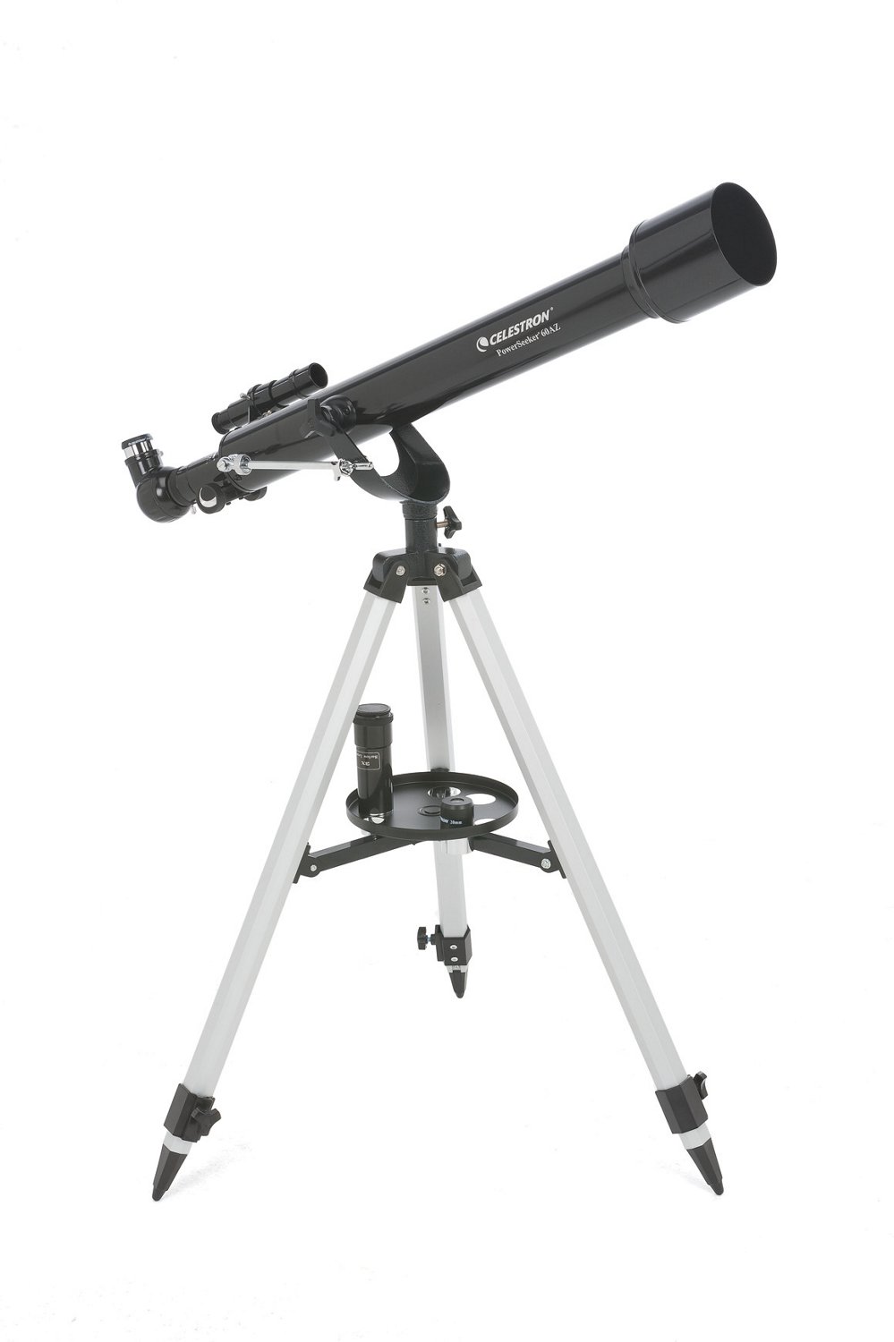 The Celestron PowerSeeker 60AZ 35 x 61 Telescope features fully coated glass optics with high-transmission coatings to deliver bright, clear images and a 3x Barlow lens that triples the magnifying power of both eyepieces to bring distant objects near. The slow-motion controls offer smooth tracking, while the accessory tray offers convenient storage. Comes with an aluminum tripod and "The Sky®" planetarium software.