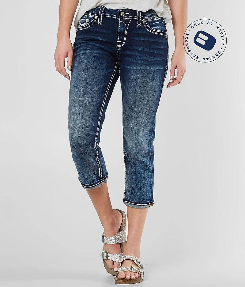 Mid-rise zip fly stretch cuffed capri 23" cuffed, 24" uncuffed Curvy fit, eased through the hip and thigh Rhinestone and studs on metallic embroidered faux flap back pockets Hand sanding, whiskering, and grinding details Shoe sku 944321 Model Info: Height: 5'9" | Bust: 33" | Waist: 27 1/2" | Hip: 36 1/4" | Wearing Size: 26