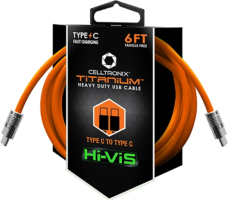 Charge batteries with the Celltronix Titanium 6 ft. C To C Cable. Its zinc alloy construction enhances durability. The silicone offers improved flexibility, and its 6-foot length extends reach. The bright orange color ensures visibility.