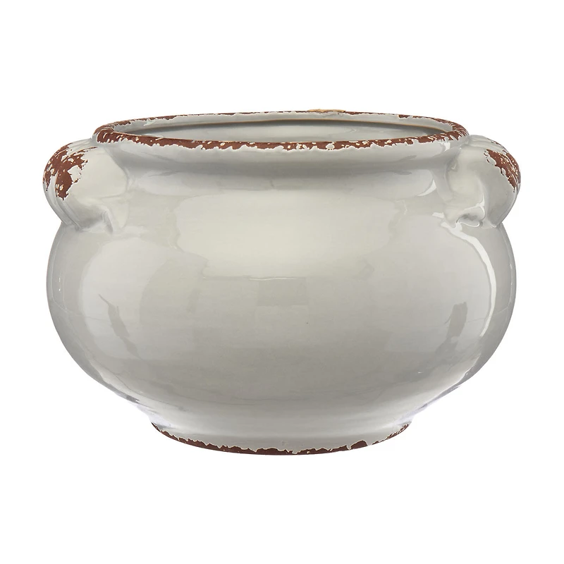 The pot has ample space for your favorite flowers, herbs, or small shrubs. Its rounded shape and smooth finish create a visually appealing silhouette that adds a touch of refinement to your garden or patio. The distressed detailing around the rim and handles gives the pot an authentic, aged look, enhancing its rustic charm.