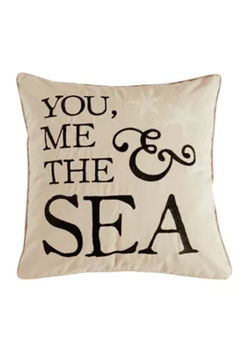 The You, Me, & the Sea decorative pillow matches perfectly with the Levtex Home Cerralvo bedding collection. This pillow is sized at 14x18in. and features the words YOU, ME, & THE SEA embroidered with a black textured fabric on a classic tan canvas ground, complemeneted with starfish finely embroidered in the corner. The cool coastal color palette makes this a versatile accessory for your bed, couch or favorite chair. The pillow comes pre-filled with a luxurious feather inner. China Imported Product Specifications 18" x 18" x 1.8" Material & Care Feather fill Cotton Machine washable