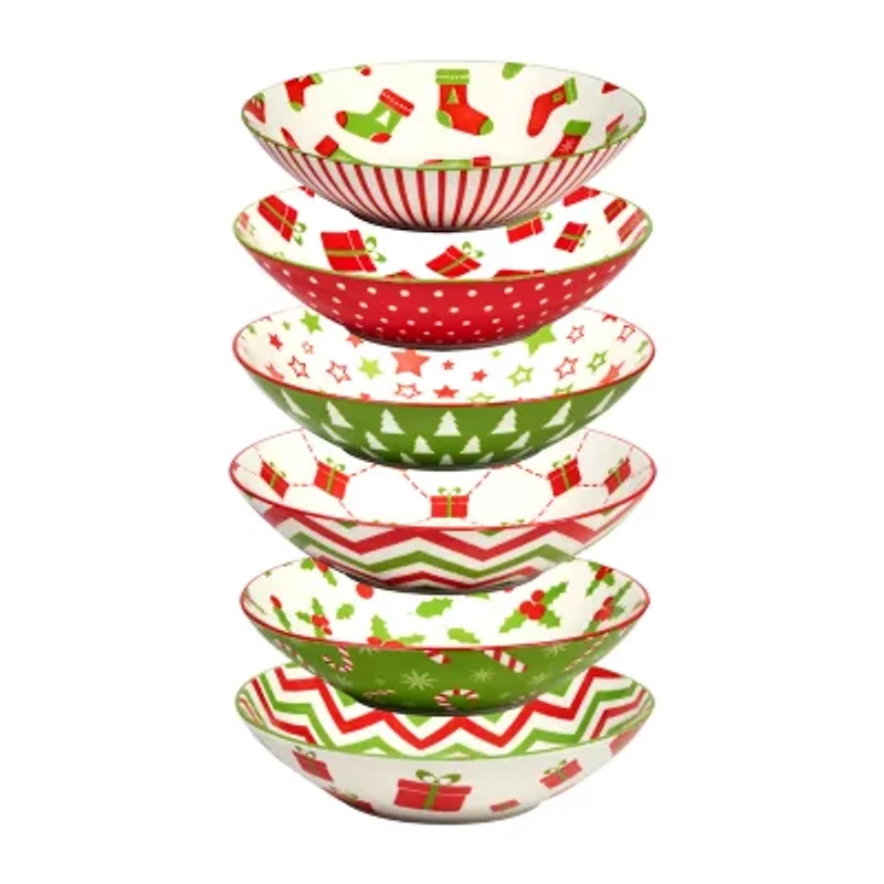 Add a splash of color to your home for the holidays with our "holiday fun" lively red and green patterns on durable porcelain mug, bowl, and canape plate 6 pc sets from certified international. Three different generously sized bowl sets (4.75" d or 6" d or 9.375" d) are uniquely decorated inside and out with 6 assorted designs, offering versatile uses for dining, serving and entertaining. The matching assorted 16 oz. Mug set and 6" d canape plate set complete this wonderful collection. Get all 5 mix and match sets! Sets contain 6 - soup bowls 40 oz