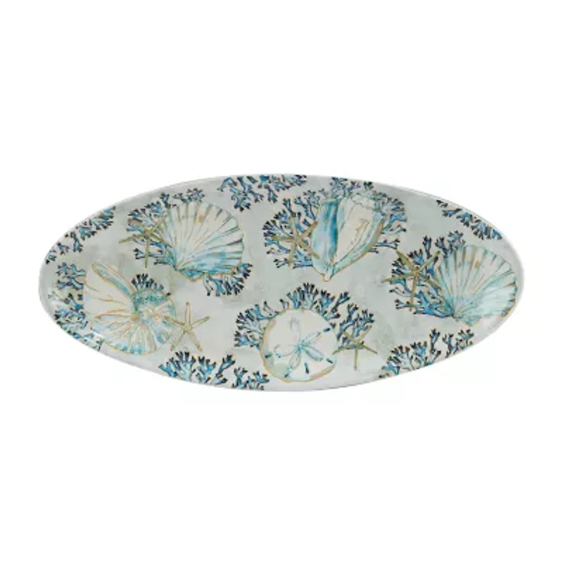 Bring the beauty of the beach to your table with certified international's playa shells fish platter designed by the artist Paul brent. Tossed seashells are outlined in gold, floating on ocean colors on this generously sized 19" l x 9.25" w ceramic platter, perfect for serving fish and family meals. Coordinating dinnerware and serve ware is available to complete this coastal look in your home!