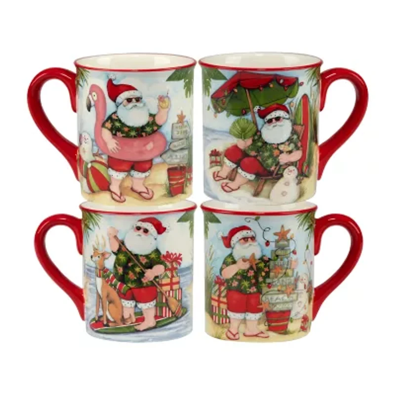Colorful scenes of Santa enjoying his well-earned vacation at the beach decorate certified international's "Santa's wish" collection of melamine dinnerware, serve ware, ceramic mugs, and 3-d cookie jar. Designed by the popular artist Susan winget, this mix and match assorted images of Santa in his tropical shirt, sunglasses and flip flops will delight your family and friends. The heavyweight 100% melamine is durable and great for indoor and outdoor holiday dining, along with the coordinating ceramic mugs. The sculpted, hand painted Santa cookie jar is a fun and decorative way to keep your holiday cookies and treats fresh. Get the matching 3-d Santa s&p set for your holiday table. Sat includes 4 - 18 oz mugs