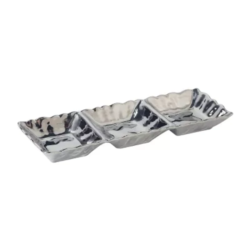 This elegant "silver coast" serveware from certified international looks like metal but is actually metallic glazed durable porcelain! This exciting collection features uniquely shaped yet functional serveware such as a generously sized platter, deep bowl, chip & dip, 4 pc condiment set, sectional server, cracker tray and set of 4 snack bowls. The rich silver metallic finish is food safe, stain, scratch, and tarnish resistant. Impress your family and guests with these beautiful pieces which complement any table setting! 3-section tray measures 15" x 5.5"