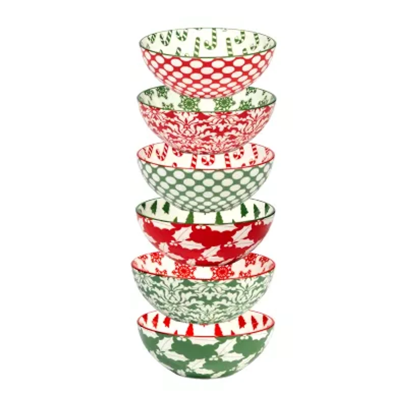 Celebrate the winter holiday season in style with our "winter medley" elegant red and green patterns on durable porcelain mug, bowl, and canape plate 6 pc sets from certified international. Three different generously sized bowl sets (4.75" d or 6" d or 9.375" d) are uniquely decorated inside and out with 6 assorted designs, offering versatile uses for dining, serving and entertaining. The matching 6 assorted 16 oz. Mug set and 6" d canape plate set complete this wonderful, elegant collection. Get all 5 mix and match sets! This set contains 6 all-purpose bowls 30 oz capacity