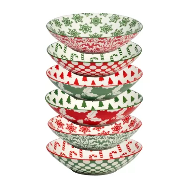Celebrate the winter holiday season in style with our "winter medley" elegant red and green patterns on durable porcelain mug, bowl, and canape plate 6 pc sets from certified international. Three different generously sized bowl sets (4.75" d or 6" d or 9.375" d) are uniquely decorated inside and out with 6 assorted designs, offering versatile uses for dining, serving and entertaining. The matching 6 assorted 16 oz. Mug set and 6" d canape plate set complete this wonderful, elegant collection. Get all 5 mix and match sets! This set contains 6 soup bowls 40 oz capacity