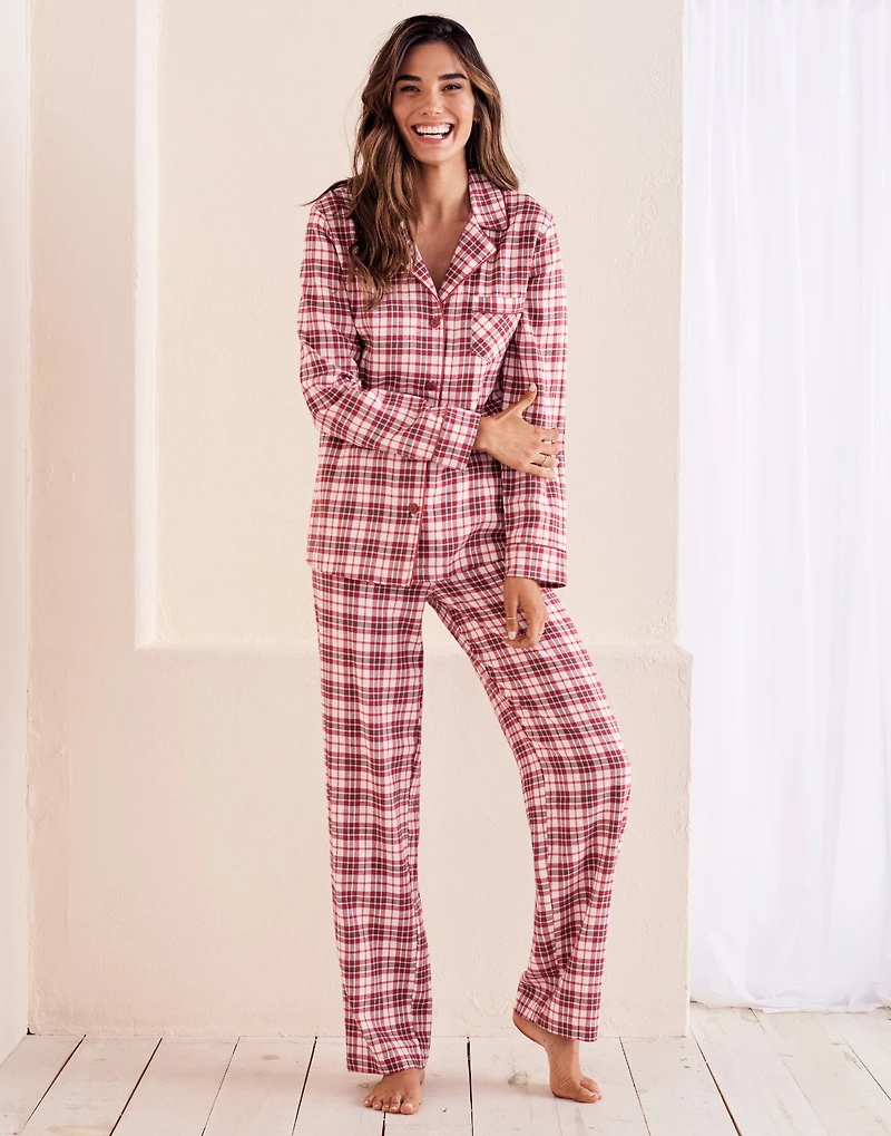 The Chafia Plaid long PJ set in red is perfect for chilly winter nights. The cotton flannel set includes a notched collar top with long sleeves and patch pocket, contrast piping and buttons, and pants with an elastic waist and drawstring tie. (Available in sizes XS-4X)