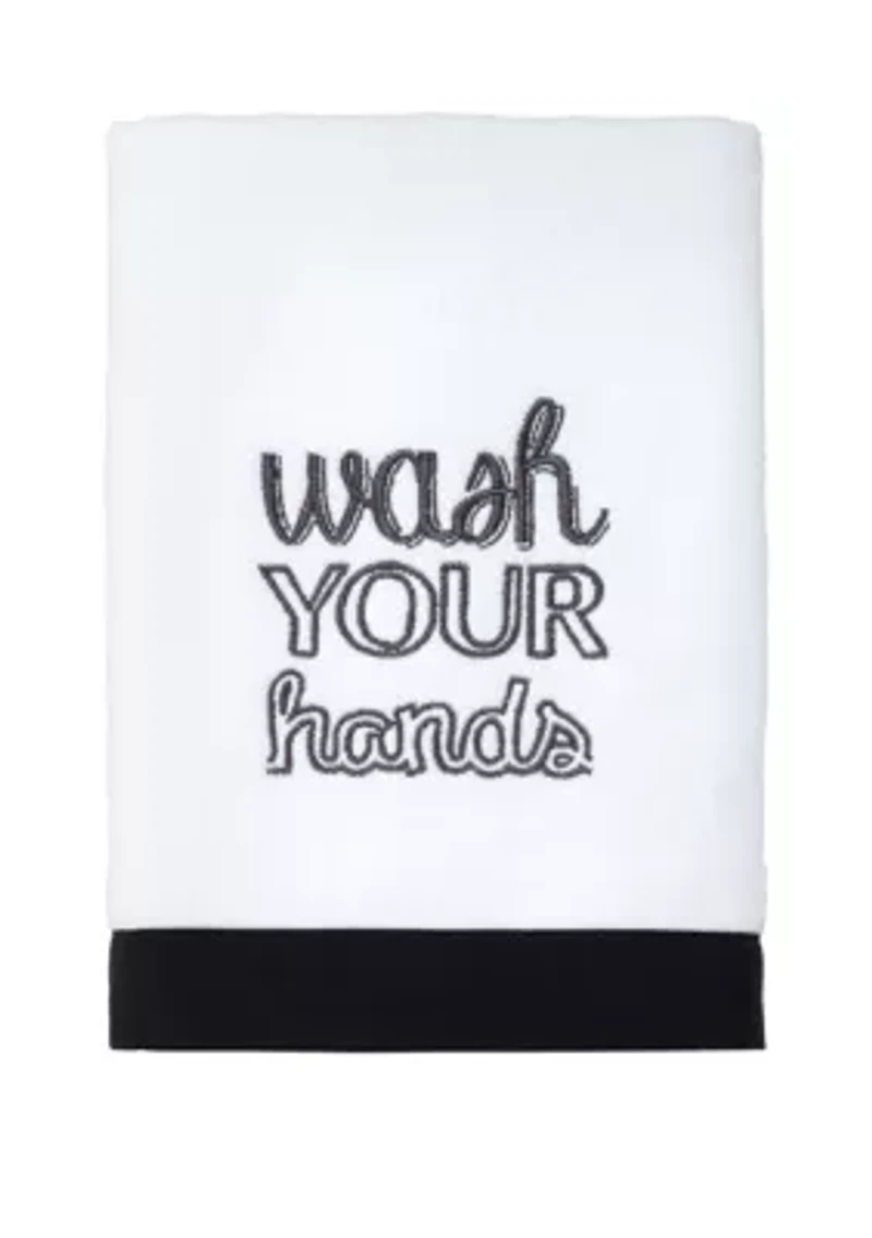 The Avanti Chalk It Up Hand Towel features 'wash your hands' embroidered, each word in different fonts, on a 100% cotton white sheared towel. The towel is finished with a coordinating fabric border. Imported Product Specifications 0.1 in x 16 in x 30 in Material & Care Cotton Machine washable