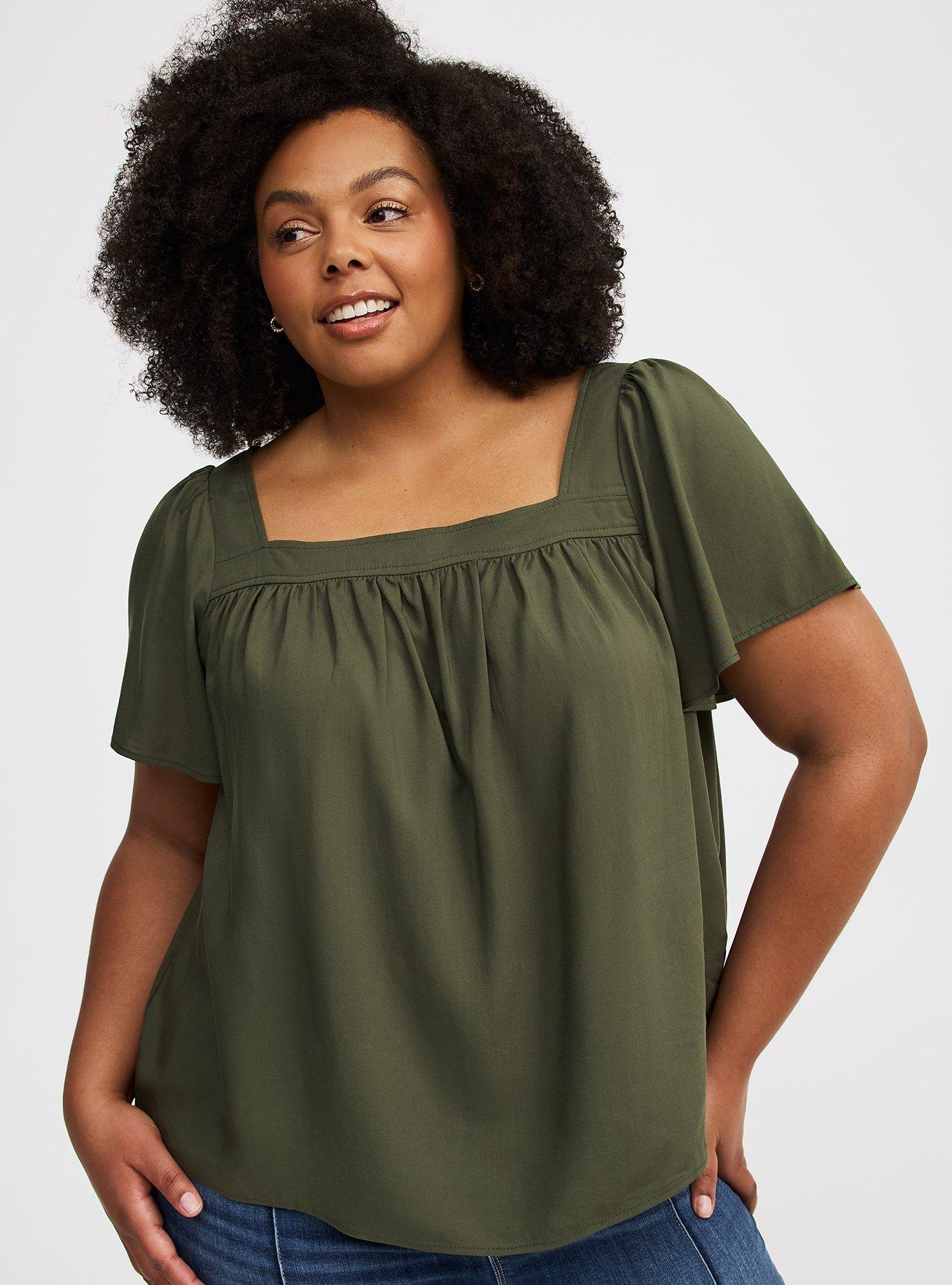 FIT Flowy silhouette. Measures 28'' from shoulder (size 2). MATERIALS + CARE Challis woven fabric: Your favorite easy-but-polished fabric. Stretch level: None. 100% rayon. Machine wash cold. Line dry. Imported. DETAILS Square neckline. Short flutter sleeves. Shirring.