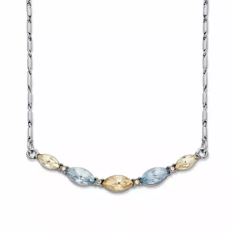 Wrap your neckline in glam appeal and fiery shimmer with this fabulous bib necklace. Featuring champagne and aquamarine blue crystal marquise-cut stones in a single row and suspended from a barrel link chain, you'll love how this adds elegant shimmer. 17" - 19" length. Silvertone.2 Marquise Faceted Cut Aquamarine Crystals, 10 mm x 5 mm1 Marquise Faceted Cut Champagne Crystal, 10 mm x 5 mm2 Marquise Faceted Cut Pink Crystals, 8 mm x 3.5 mm; 4 Round Faceted Cut Crystals, 2 mm x 2 mm; SilvertoneDimensions: 5.5 mm wide x 17 inches long x 5.5 mm high, plus 2 inch extension; Contains 2.90 grams of Sterling Silver; Shank Width: 1.8 mm wide; SilvertoneDimensions: 5.5 mm wide x 17 inches long x 5.5 mm high, plus 2 inch extensionIncludes gift box and drawstring pouch Lobster closure, 9 Polished finish Warranty available China Imported Product Specifications 0.43 in x 17 in x 0.22 in, 17" length Material & Care Metal, Silver-tone metal Clean with a soft cloth.