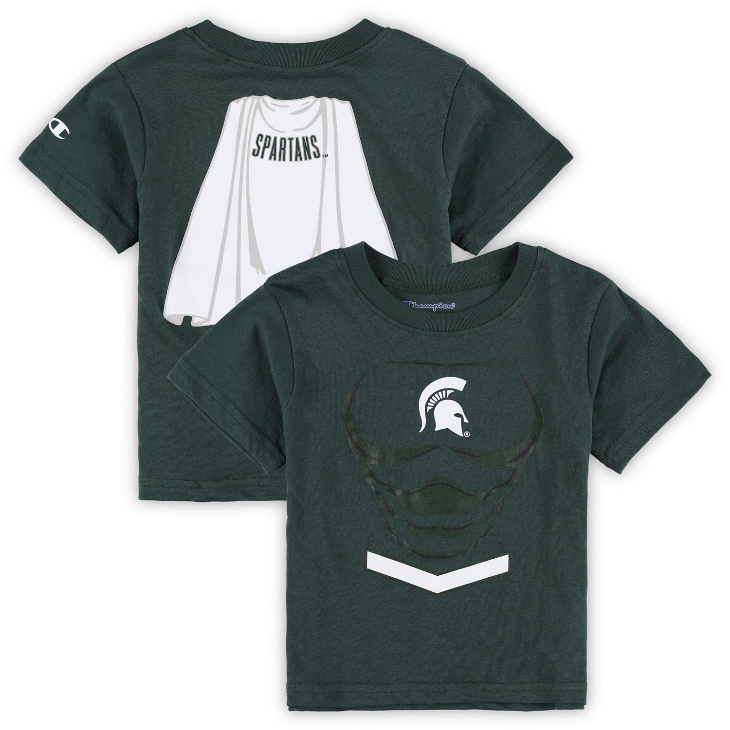 Not all Super Heroes wear capes but your kiddo feels like one when they sport this Champion T-shirt Its bold Michigan State Spartans graphics spotlight one of their favorite forms of heroes In addition soft fabric and a relaxed construction offer comfort with each wear