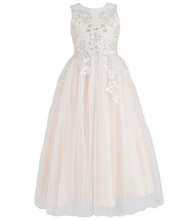 Chantilly Place Big Girls Sleeveless Floral Sequin Embroidered Shirred Mesh Skirt Back Bow Dress