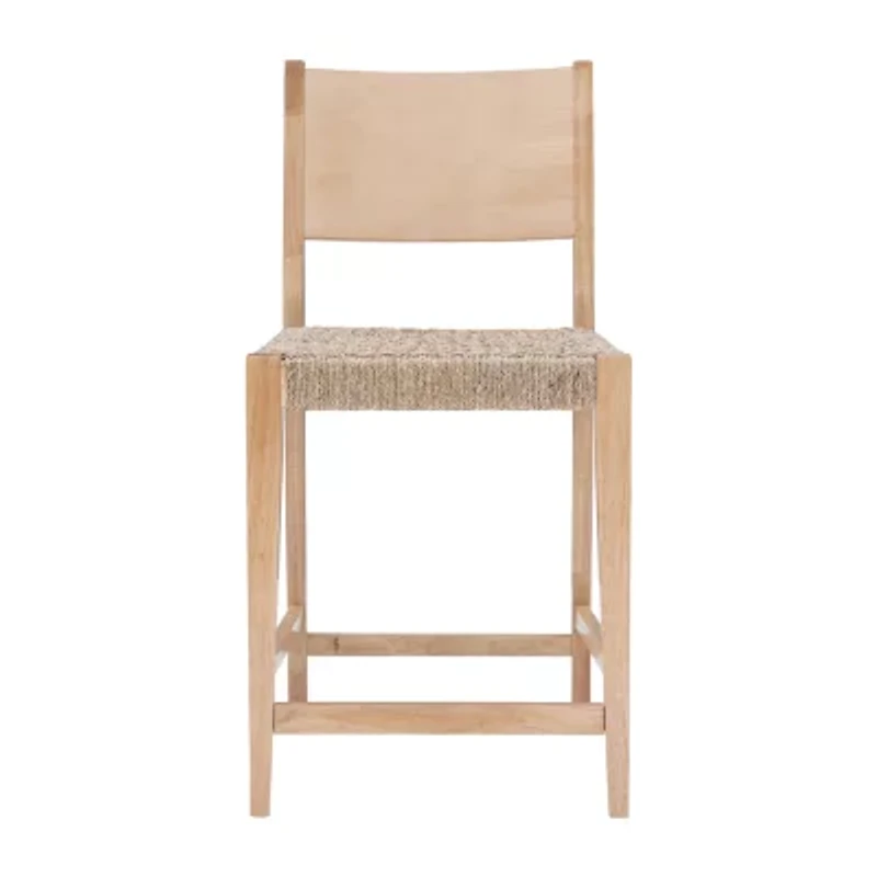 This counter stool is made in the spirit of midcentury modern design with just a hint of rustic farmhouse sentiment. The sturdy frame in brown is made of solid rubberwood and is equipped with footrails for added stability and convenience. A handstitched basketweave seat provides stylish comfort, while an angled backrest allows for easy leaning. With a seat height of 24 inches, this stool is best paired with any bar standing at 35" to 39". Arrives in a set of two.