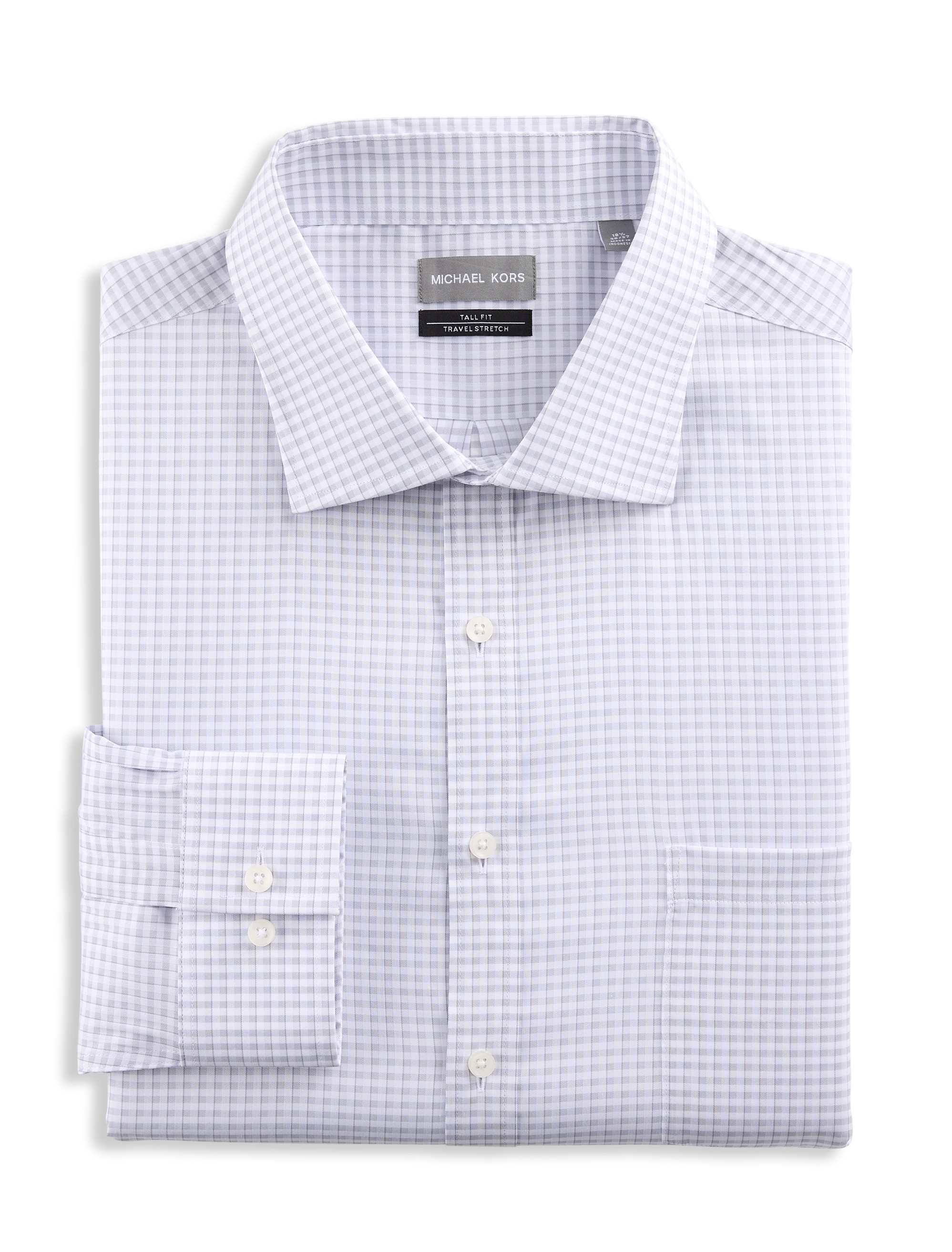 This hard-working plaid dress shirt from Michael Kors instantly updates your wardrobe. Its innovative stretch fabric offers luxurious softness, resists wrinkles and wicks away moisture so you feel cool and comfortable throughout your day. The polished button-down style is versatile enough to pair with a luxe tie and suit or jeans and a sport coat; it's that versatile!