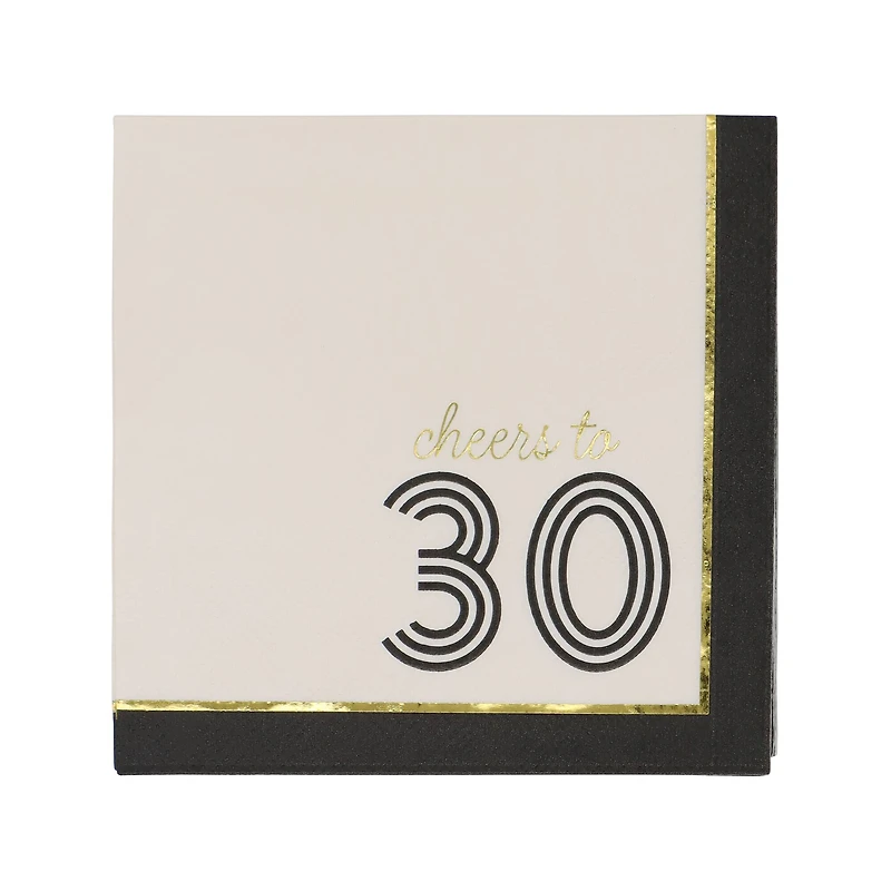 Give your 30th birthday a stylish flourish with these eye-catching paper beverage napkins from Ashland. Coordinate these gold-foil accented napkins that read "Cheers to 30" with colorful plates and glassware for a table sure to stand out as you enjoy the occasion with friends and family.Details:Black and gold on white with foil4.8" x 4.8" (12.1cm x 12.1cm) folded napkin size20 napkins2-plyTissue paperWARNING: Do not place in the microwave. Product may ignite.