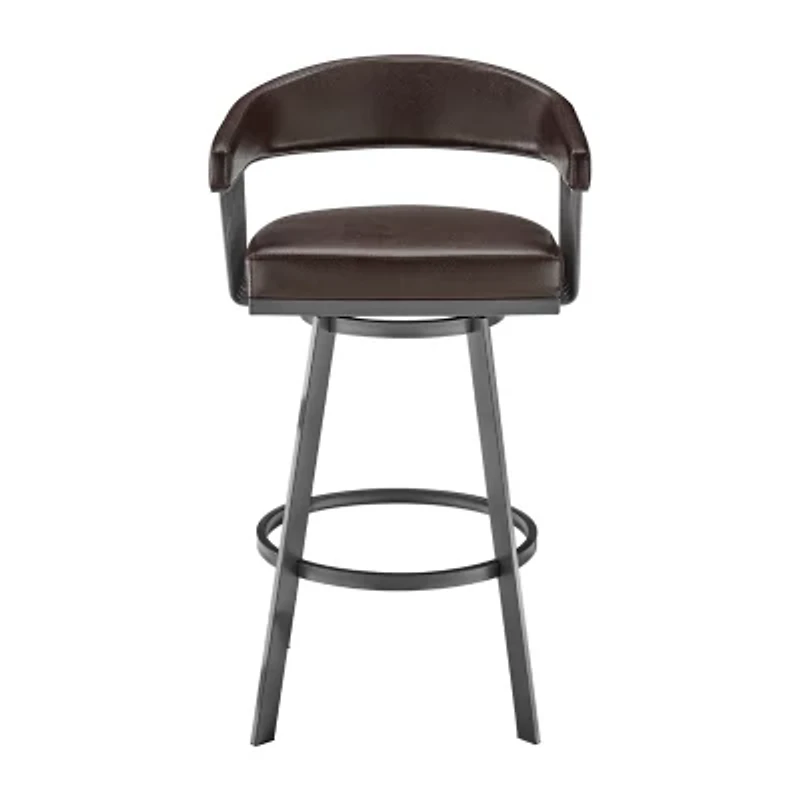 Bring the Chelsea swivel bar stool from Armen living into your beautiful home! It is the best choice to bring in another seating option and does so without compromising on comfortability. The wonderful faux leather and metal accents give the Chelsea a look of refinement, making you proud to show it off in your home. The foam-padded seat cushion offers you the most comfort available to you! This curved open-back stool will keep you relaxed while enjoying dinner with your friends and family. The Chelsea also features a convenient metal footrest, for additional support and stability. The Chelsea comes in a variety of color and finishes; black, gray, and white faux leather with brushed stainless-steel finish, black or vintage gray faux leather with black finish, chocolate faux leather and java finish, and white faux leather with silver finish. All color options are available in your choice of 26" counter height and 30" bar height.