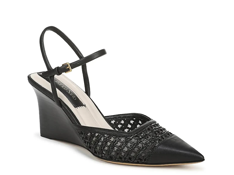 The Franco Sarto Cherie wedge pump combines artistry with comfort for a look that’s both stylish and sustainable. The ankle strap offers a secure fit, while the pointed cap toe refines the silhouette. Finished with a stacked wedge heel, it delivers graceful elegance and versatile appeal for any occasion.