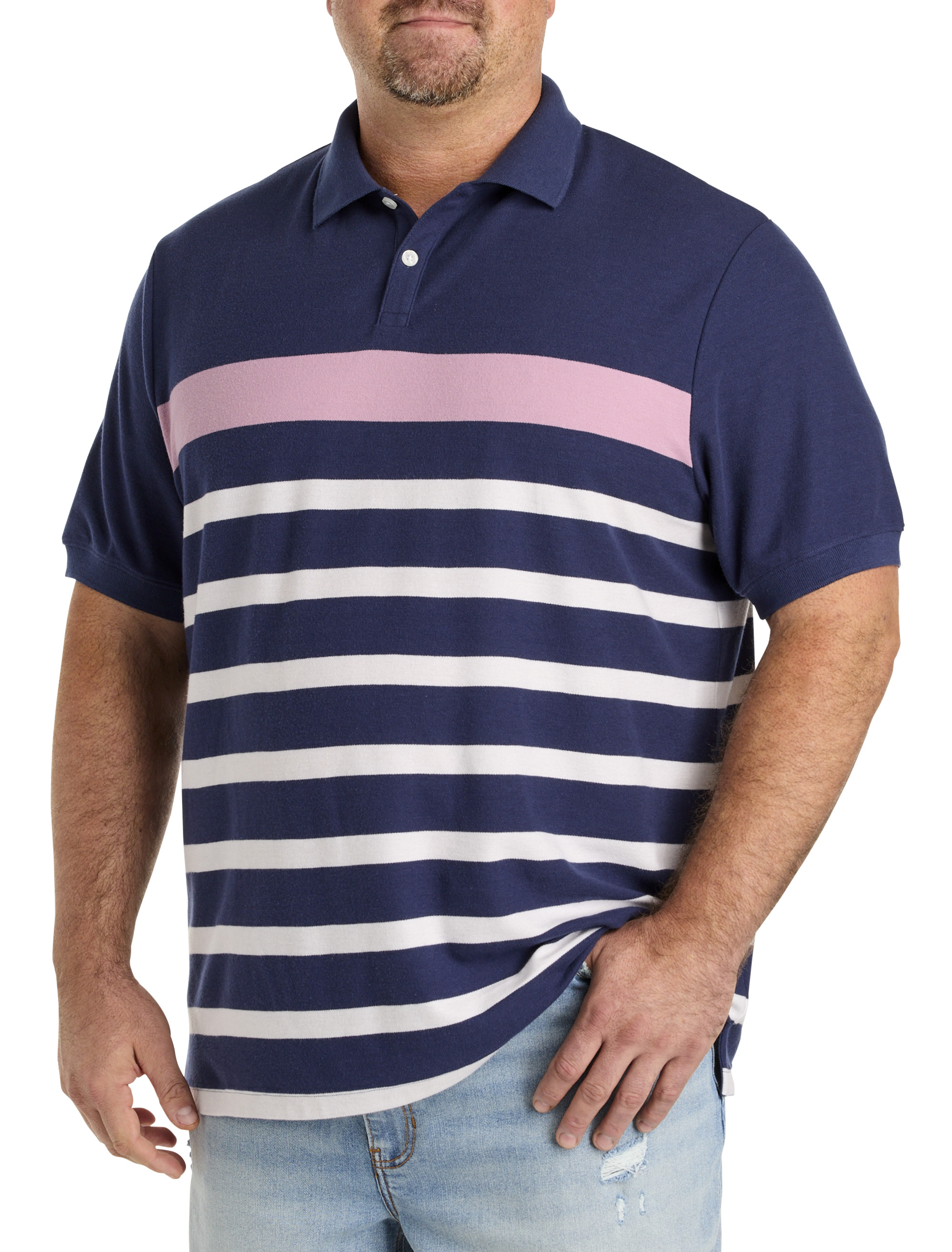 Stripe it rich with this easy-to-wear polo shirt from Harbor Bay. Lightweight, cool and comfortable, it's designed at DXL with proper proportions that fit and flatter Big + Tall guys and made from a cotton and polyester blend. It's versatile enough for everyday wear, allows you the freedom to move without restriction and easily pairs with shorts, jeans, chinos and more.