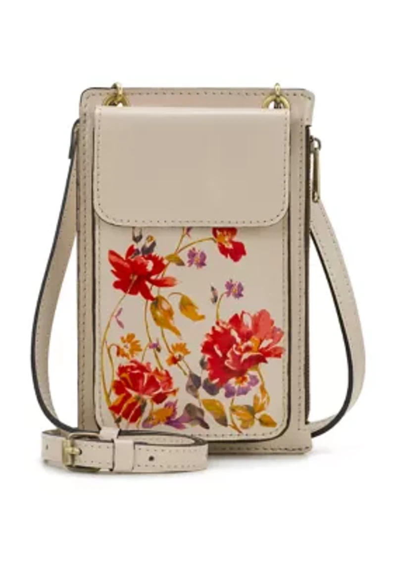 This luxurious leather phone pouch, crafted in the Aegean Blooms print, is a stylish and practical accessory. The front pouch with flap and magnetic snap closure keeps your phone secure and accessible, while the back features built-in card slots, slip pockets, and an ID window. Carry it with the crossbody strap for hands-free convenience. Crossbody strap with 25.5" drop Exterior: 1 front pouch pocket with flap, 1 full-size zip pocket with faux suede lining, deep embossed grape leaf floret logo, burned edge finish Signature brushed brass hardware Interior: 11 credit card slots, 1 slip pocket, 1 ID window; leather trim, nylon lining Imported Product Specifications 5" W x 7.75" H x 1.5" D Material & Care Leather trim Leather Clean with a soft cloth