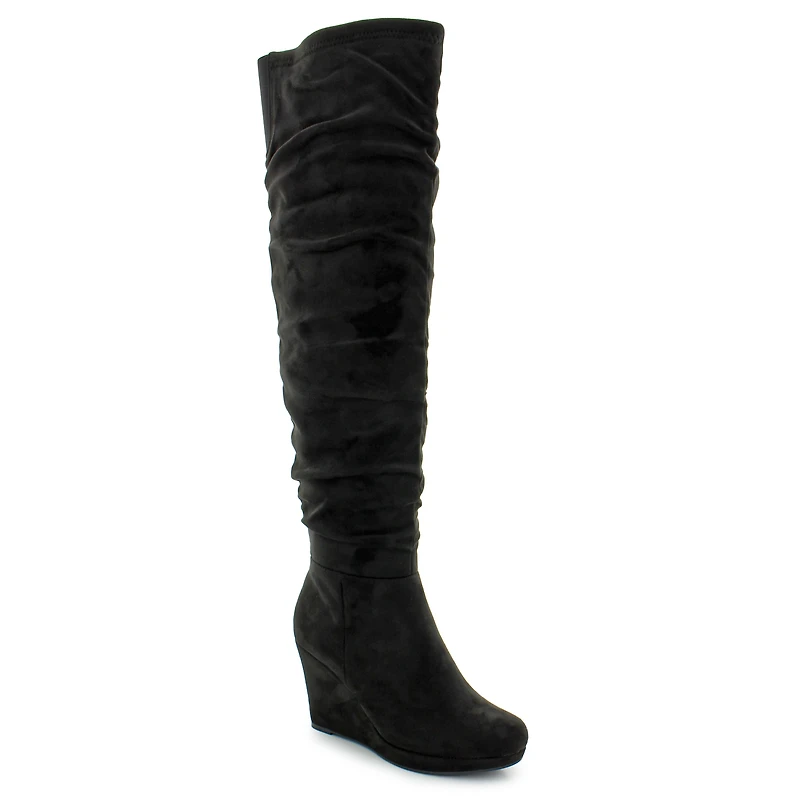 The Chinese Laundry Larisa Over-the-Knee Wedge Boots are the sophisticated finish your wardrobe craves. Masterfully shaped from plush faux suede, these boots feature a sleek rounded toe and a dramatically chic 17-inch over-the-knee shaft. Thoughtful design details include an elastic gusset at the back, ensuring a tailored yet flexible fit, and an 8-inch zipper along the instep for seamless entry. Resting on a stable wedge heel, the Larisa boot delivers both commanding height and all-day wearability.