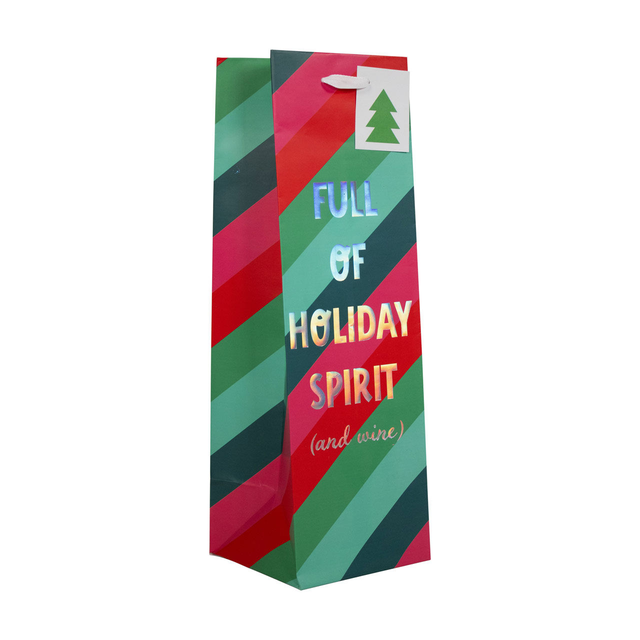 The first design features vibrant diagonal stripes in classic holiday colors—red, green, and teal—decorated with the playful phrase "FULL OF HOLIDAY SPIRIT (and wine)" in shimmering holographic lettering. A charming green Christmas tree tag adds the perfect finishing touch, making it an ideal choice for holiday parties or as a gift for your favorite wine enthusiast.