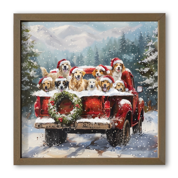 Take a trip to the countryside with these festive, furry friends! The Christmas Puppies in a Truck Framed Art Print will adorably spread the holiday cheer all throughout your farmhouse. Overall dimensions Width: 16" Depth: 1.5" Height: 16" Frame crafted of wood Brown frame finish Features puppies in a truck Mounted on board Hues of red, white, blue, green, and brown Weight: 2.2 lbs. Hangs from back-mounted hardware Color may vary due to natural tones of wood Designed and printed in the USA Care: Dust with a soft, dry cloth. This item is available at Kirklands.com only, not available in stores. Please note: this item cannot be shipped to APO/FPO addresses.