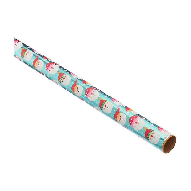 The first design features a playful Santa Claus pattern, with jolly Santa faces adorned in colorful hats set against a vibrant teal background. The foil finish adds a delightful shimmer, making each gift sparkle under the Christmas tree. The cheerful Santas are sure to bring a smile to the faces of both the young and the young at heart.