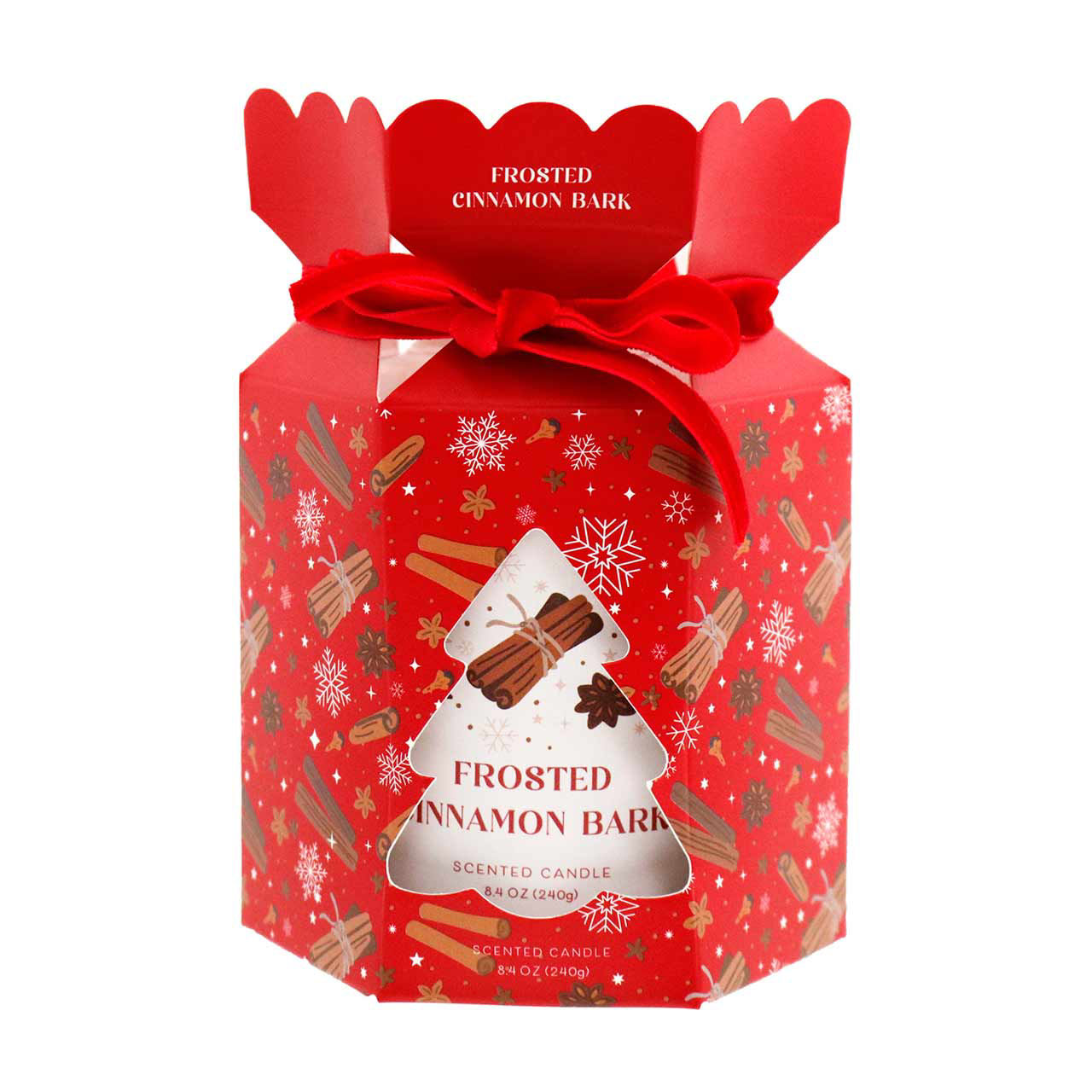 Bring the festive spirit into your home with our Red Candy Box featuring the delightful Frosted Cinnamon Bark scent. Perfectly packaged in a beautifully designed red box adorned with charming illustrations of cinnamon sticks and snowflakes, this scented candle is a holiday essential that combines warmth and elegance.