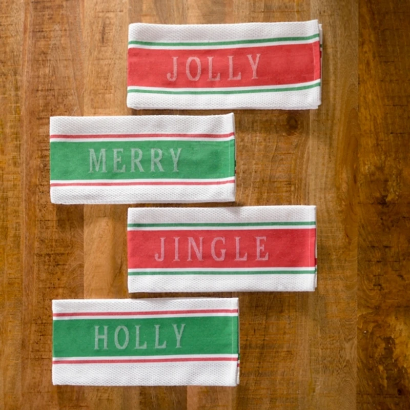Cooking, baking, and clean up will feel more festive with the set of Christmas Sentiment Kitchen Towels! It will also make a perfect gift for anyone who loves to host holiday get-togethers. Set includes four (4) towels Each towel measures 18L x 28H in. Crafted of 100% cotton Towel A features the text "Jolly" Towel B features the text "Merry" Towel C features the text "Jingle" Towel D features the text "Holly" Accented with striped patterns Hues of white, red, and green Care: Machine wash cold. Dry on low temperature. Contact your local Kirkland's store for availability. Quantities and selection may vary by location.
