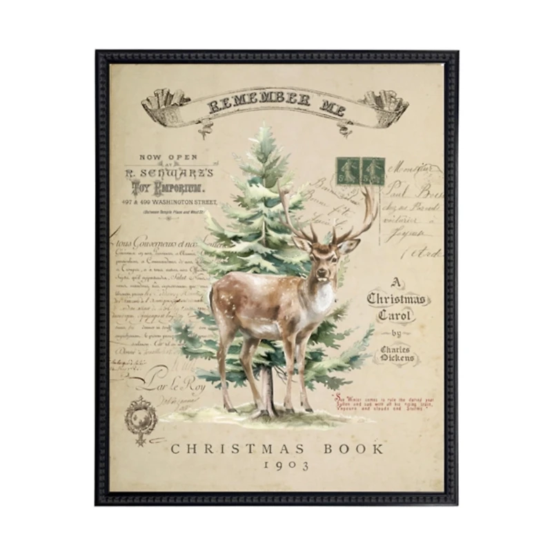 Incorporate vintage style into your holiday décor with the Christmas Snowy Deer Collage Framed Art Print. Detailed with a deer and winter tree illustration, this festive print captures the comforting, nostalgic feeling of the season. Overall dimensions Width: 19 in. Depth: 1 in. Height: 25 in. Beaded frame detailing Black frame finish Features a reindeer and winter tree collage design Mounted on board Hues of beige, green, brown, and black Weight: 4 lbs. Hangs from back-mounted hardware Care: Dust with a soft, dry cloth. This item is available at Kirklands.com only, not available in stores. Please note: this item cannot be shipped to APO/FPO addresses.