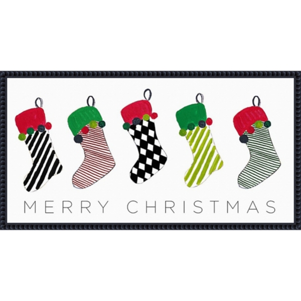 This Christmas Stockings Framed Canvas Art Print perfectly captures the warmth and nostalgia of the holidays. This piece is sure to bring festive spirit and cozy charm to your home. Overall dimensions Width: 27 in. Depth: 1.5 in. Height: 14 in. Distinctively printed on stretched canvas Frame crafted of plastic Black beaded frame finish Features the phrase "Merry Christmas" with Christmas stockings Hues of red, green, white, and black Artist: Patricia Pinto Weight: 2 lbs. Ready to hang - hanging hardware attached Care: Dust with a soft, dry cloth. This item is available at Kirklands.com only, not available in stores. Please note: this item cannot be shipped to APO/FPO addresses.