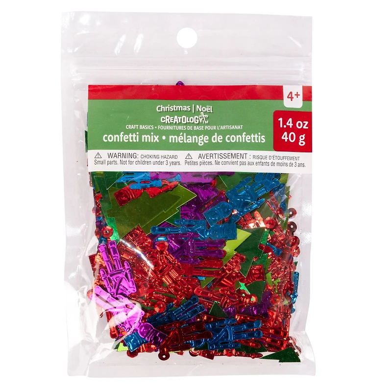 This fun Christmas confetti mix features tree and nutcracker shapes in multiple colors. You can use the confetti as filler in a gift basket combined with tissue paper, to scatter across a party table display or as an embellishment in papercraft projects.Details:Multicolor1.4 oz. (40 g)ResealablePVCConforms to ASTM D-4236For ages 4 and up