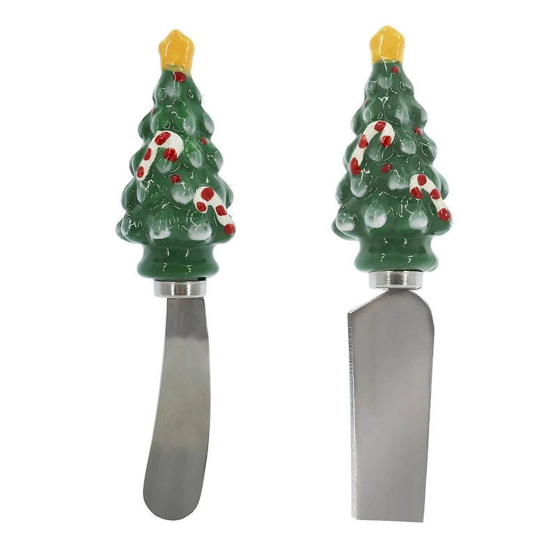 Put together a beautiful winter charcuterie board and pair it with this spreader set from Ashland. Featuring a ceramic Christmas Tree handle and a stainless steel knife, this set of two can spread cheeses, jams, and more at your holiday party.Details:Green1.5" x 1.5" x 5.75" (3.8cm x 3.8cm x 14.6cm) each1 setHand wash onlyNot for use in microwave, oven or dishwasherDolomite and stainless steel