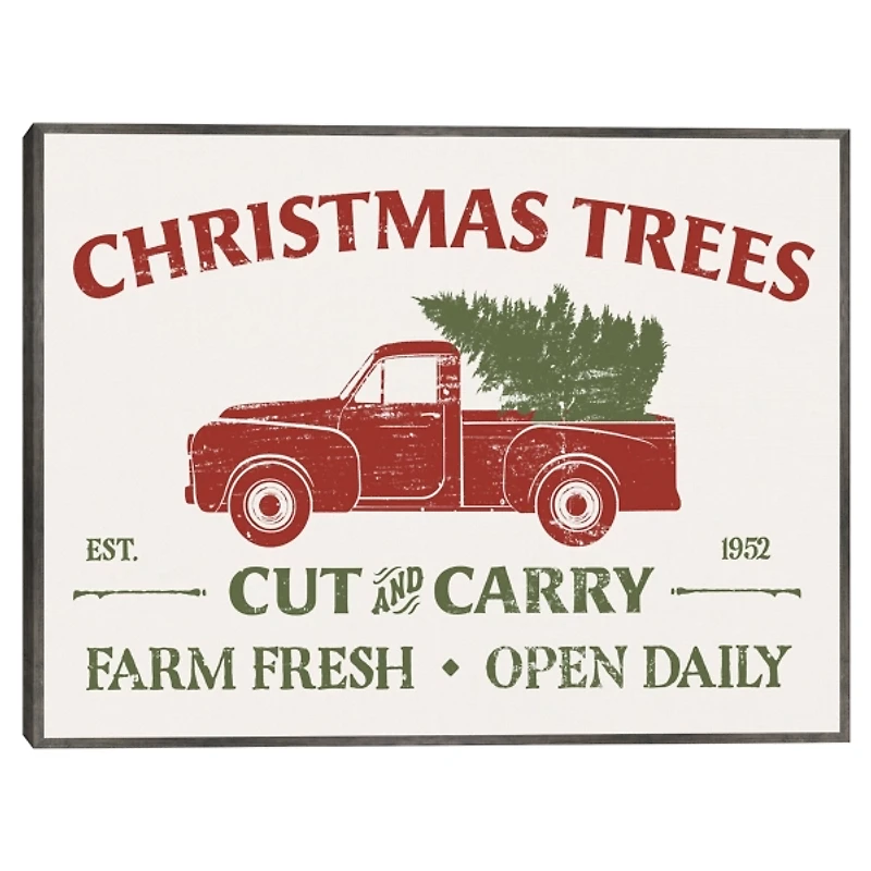 Deck your halls with this Christmas Trees Truck Framed Canvas Print. With a sturdy frame, this piece will bring holiday cheer to your home for years to come! Overall dimensions Width: 19" Depth: 1.5" Height: 25" Distinctively printed on stretched canvas Dark brown frame finish Features the phrases "Christmas trees" "Cut and carry" "Farm fresh" and "Open daily" Truck with Christmas tree subject Hues of red, green, and white Artist: Victoria Barnes Weight: 5 lbs. Hangs from back-mounted hardware; sawtooth hangers included Care: Dust with a soft, dry cloth. This item is available at Kirklands.com only, not available in stores. Please note: this item cannot be shipped to APO/FPO addresses. WARNING: Cancer and Reproductive Harm - For more information go to www.P65Warnings.ca.gov .